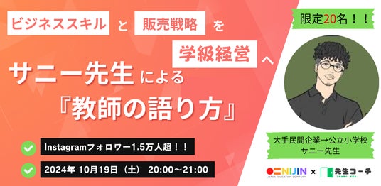 株式会社NIJIN(本社:東京都江東区、代表取締役:星野達郎)が運営する教育オンラインサロン『NIJIN教育ラボ』は、教員向け伴走型1on1コーチングサービス『先生コーチ』と共催で、オンラインセミナー「ビジネススキルと販売戦略を学級経営へ!サニー先生による『教師の語り方』」を2024年10月19日(土)に開催いたします。