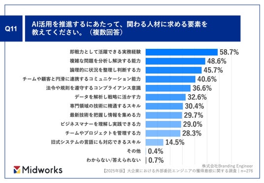 「Q11. Q9で「すでに注力している」「現在は注力していないが、今後注力する予定がある」と回答した方にお聞きします。AI活用を推進するにあたって、関わる人材に求める要素を教えてください。(複数回答)」(n=276)と質問したところ、