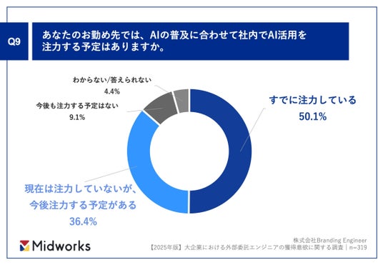 「Q9. あなたのお勤め先では、AIの普及に合わせて社内でAI活用を注力する予定はありますか。」(n=319)と質問したところ、