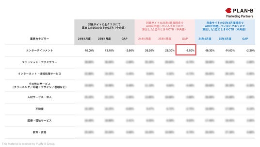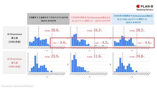 SEOを中心にデジタル領域全般のマーケティング支援を行う株式会社PLAN-Bマーケティングパートナーズ(東京都品川区、代表取締役:鳥居本 真徳)は、AI Overviews (Google検索結果に表示されるAIによる要約)の表示に伴うクリック率(CTR)の変動を業界別・サイト別に明らかにするため、