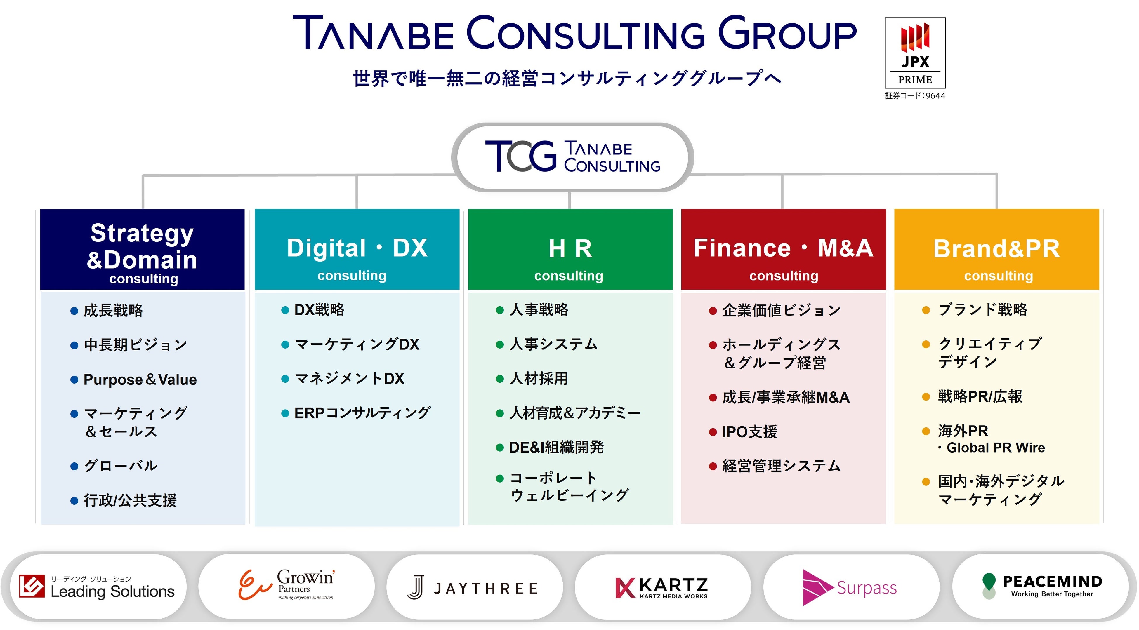 https://www.meti.go.jp/policy/mono_info_service/healthcare/kenkoukeiei_yuryouhouzin.htmlタナベコンサルティンググループ(TCG)について TCGは、1957年創業の東証プライム市場に上場する日本の経営コンサルティングのパイオニアです。「企業を愛し、企業とともに歩み、企業繁栄に奉仕する」という経営理念のもと、未来の社会に向けた貢献価値として「その決断を、愛でささえる、世界を変える。」というパーパスを掲げております。現在は、グループ8社、約900名のプロフェッショナル人材を有する経営コンサルティンググループとなり、国内外の中堅企業を中心とした大企業から中規模企業のトップマネジメント(経営者層)を主要顧客とし、創業以来18,900社以上の支援実績を有しております。