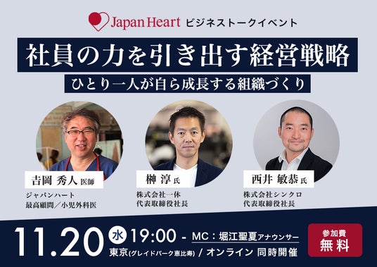 日本発祥の国際医療NGOである(認定)特定非営利活動法人ジャパンハート(東京都台東区 理事長:吉岡春菜)は、11月20日(水)19時00分よりビジネストークイベント『社員の力を引き出す経営戦略~ひとり一人が自ら成長する組織づくり~』を東京会場およびオンラインで同時開催することを決定しました。