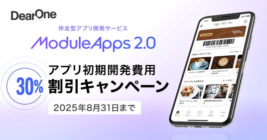 株式会社NTTドコモのマーケティング分野における新規事業型子会社である株式会社DearOne(本社:東京都港区、代表取締役:河野 恭久、以下:DearOne)は、DearOneが提供する伴走型アプリ開発サービス「ModuleApps2.0」(モジュールアップス ニーテンゼロ)でのアプリ開発初期費用が30%割引となる、初のサマーキャンペーンを2025年8月31日まで開催します。