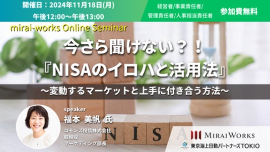 株式会社みらいワークス(本社:東京都港区、代表取締役社長 岡本 祥治、以下「当社」)は、2024年11月18日(月)に、NISAの上手な活用法について、コモンズ投信株式会社 取締役 マーケティング部長 福本 美帆 氏を迎えてオンラインセミナーを開催します。