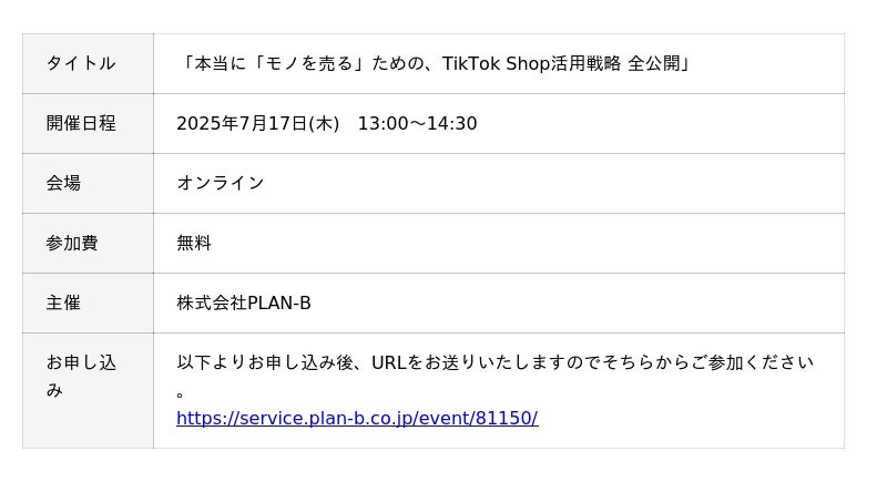 インフルエンサーマーケティング事業を展開する株式会社PLAN-B(本社:東京都品川区、代表取締役:鳥居本 真徳)は、2025年7月17日(木)13:00~14:30に無料オンラインセミナー「本当に「モノを売る」ための、TikTok Shop活用戦略 全公開」を開催します。