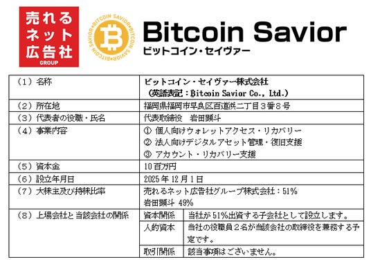 国内上場企業として初めて、ビットコインをはじめとする暗号資産(仮想通貨)・NFTを含むデジタル資産の「復旧・保全」を支援する「デジタルアセット・リカバリー事業」を行う新会社『ビットコイン・セイヴァー株式会社(₿itcoin Savior Co., Ltd.)』を本日2025年12月1日に設立したことをお知らせいたします。