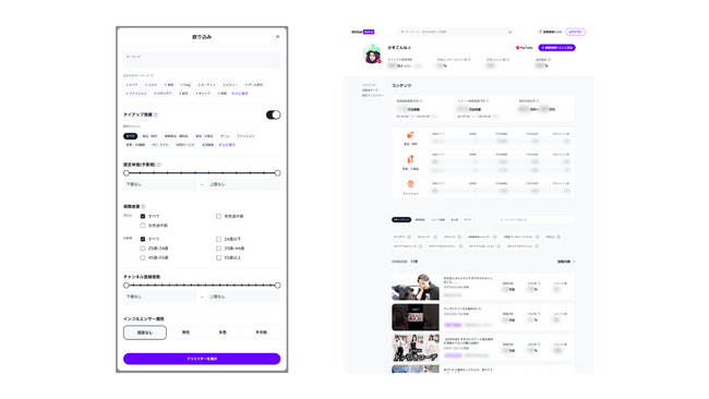 PRしたい商品やサービスに合わせて、キーワード・タイアップ実績・フォロワー数・想定単価・視聴者の性年代などを設定して検索。クリエイターの詳細ではエンゲージメント率やフォロワー数推移、タイアップ投稿の数値実績、投稿コンテンツの詳細情報などを見ながら、キャスティング候補を絞り込むことができます。