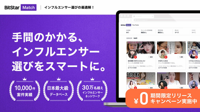 「BitStar Match」では、企業のマーケティング担当者自らが商品やサービスにマッチしたインフルエンサーを簡単に探すことができます。YouTube・Instagramにて30万人以上のデータベースから、
