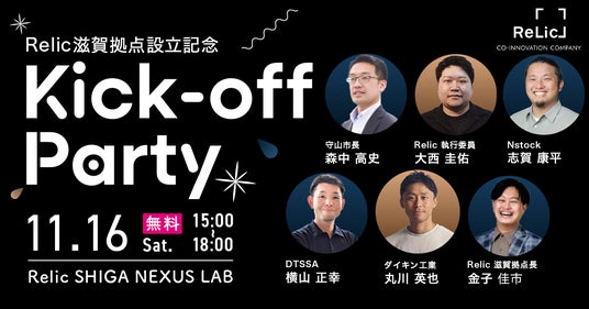 日本企業の新規事業開発やイノベーション創出を支援する事業共創カンパニーである株式会社Relic(本社:東京都渋谷区、代表取締役CEO:北嶋 貴朗、以下「Relic」)は、滋賀拠点設立記念キックオフパーティを2024年11月16日(土)15:00~18:00に滋賀県守山市「Relic SHIGA NEXUS LAB」にて開催いたします。