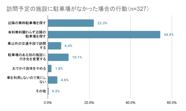 半数以上が「有料無料関わらず近隣の駐車場を探す」と回答。つぎに多いのは「近隣の無料駐車場を探す」という回答。つまり、行きたいと思った施設に駐車場がなかった場合、まず周辺の駐車場を探すという方が多く、この時点で別の施設を探したり、おでかけ自体をやめる方は少ないようです。