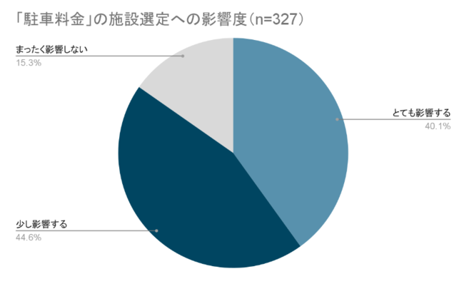 こちらは「とても影響する」が40.1%、「少し影響する」が44.6%、あわせて84.7%の親が、駐車料金が施設選びに影響すると回答。「駐車場の有無」に比べて「料金」による影響度は若干下がるものの、ともにおでかけ施設を選ぶ際の影響はかなり高いと言えるでしょう。