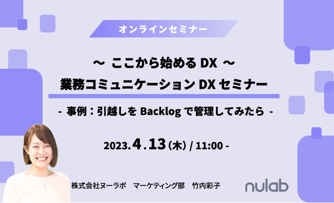 「“このチームで一緒に仕事できてよかった”を世界中に生み出していく。」をブランドメッセージに掲げ、チームのコラボレーションを促進、働くを楽しくするツール「Backlog」「Cacoo」「Typetalk」「Nulab Pass」を提供する株式会社ヌーラボ(本社:福岡県福岡市、代表取締役:橋本正徳、以下 ヌーラボ)は、これからDX(デジタル・トランスフォーメーション)に挑戦する企業の支援を強化します。その取り組みの一環として、「~ここから始めるDX~業務コミュニケーションDXセミナー」を2023年4月13日(木)11:00に開催します。