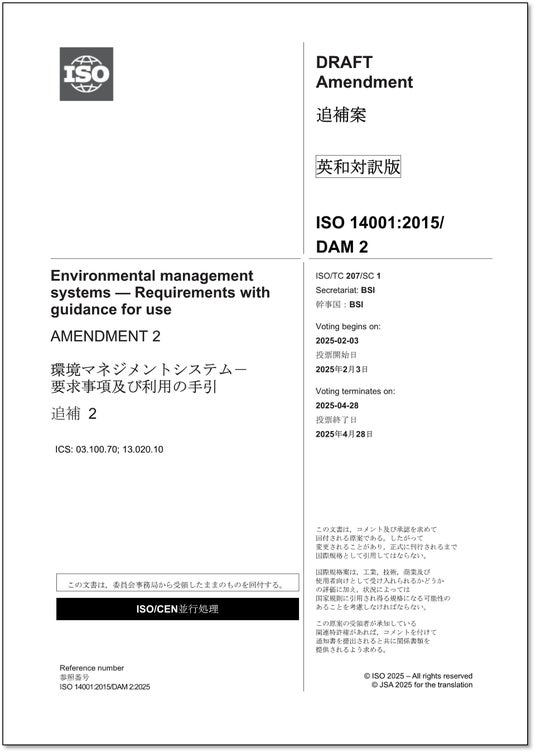 一般財団法人日本規格協会(本部:東京都港区、理事長:朝日弘)は、2025年2月17日(月)にISO 14001:2015/DAmd 2:2025「追補2-環境マネジメントシステム-要求事項及び利用の手引」の邦訳(英・日対訳版)を発行いたしました。
