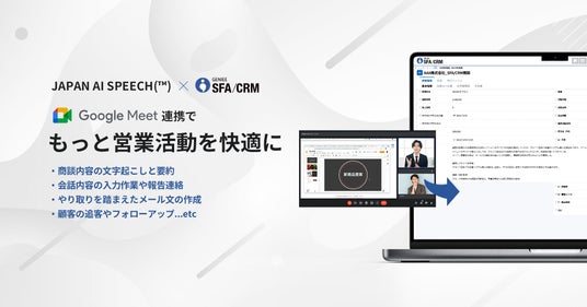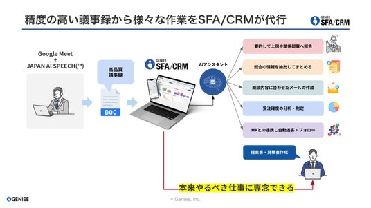 株式会社ジーニー(本社:東京都新宿区、代表取締役社長:工藤 智昭、以下ジーニー)が提供する営業管理ツール「GENIEE SFA/CRM」は、子会社であるJAPAN AI株式会社(本社:東京都新宿区、代表取締役社長:工藤 智昭、以下JAPAN AI)が提供するAI議事録作成システム「JAPAN AI SPEECH((TM))」を連携させることで、Google Meetを使ったオンライン会議の議事録を自動作成し、営業担当者の作業負担を大幅に軽減する新機能を実現しました。