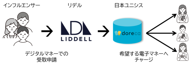 インフルエンサーマーケティング事業を展開するLIDDELL株式会社(本社:東京都港区、代表取締役:福田晃一、以下「リデル」)と、日本ユニシス株式会社(本社:東京都江東区、代表取締役社長:平岡昭良、以下「日本ユニシス」)は、インフルエンサーへの業務委託報酬を複数のデジタルマネーでの支払うことを合意・決定しました。業務委託報酬を複数のデジタルマネーで支払うために、日本ユニシスの価値交換基盤「doreca」を利用します。