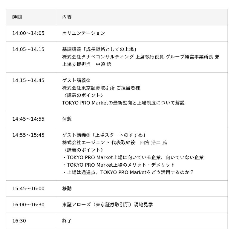 本講座では、TOKYO PRO Marketへの上場をゴールとして位置付けるのではなく、企業が持続的に成長するための突破口として、その戦略シナリオや具体的な内容を成功事例に即してお伝えいたします。株式会社タナベコンサルティング 上席執行役員 グループ経営事業所長 兼 上場支援担当 中須 悟より「成長戦略としての上場」についてご説明させていただくほか、実際にTOKYO PRO Marketへの上場を経験された株式会社エージェント 代表取締役 四宮 浩二 氏をお招きし、上場準備の実務上の課題や解決策などについて、体験談を交えてお話しいただきます。さらに、株式会社東京証券取引所のご担当者にもご登壇いただき、TOKYO PRO Marketの最新動向と上場制度について解説いただきます。講座終了後には、東証アローズ(東京証券取引所)の現地見学を実施いたします。