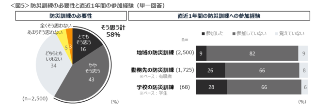 防災訓練の必要性を感じているか尋ねたところ、「とてもそう思う」は16%、「そう思う計」は58%であった。直近1年間に防災訓練への参加は、「勤務先」は26%、「学校」で28%の経験はあるが、「地域」への参加は9%と低い。<図5>