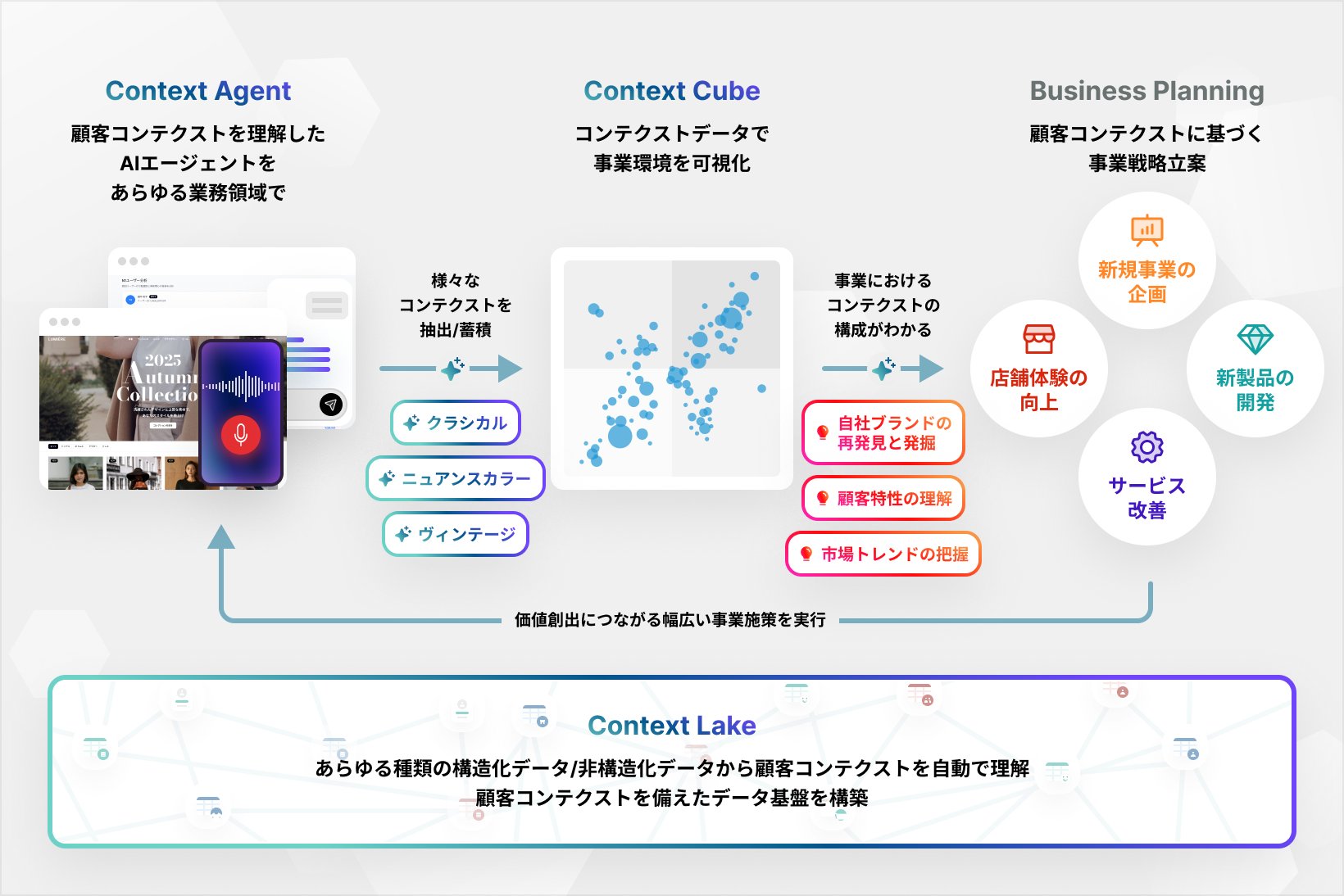 顧客コンテクストを自動で理解するContext Lakeの提供においては、そこで抽出・蓄積された顧客コンテクストとコンテクストデータを顧客体験価値向上や事業戦略策定につなげるためのAIとして、コンテクストデータで事業環境を可視化して戦略策定につなげる「Context Cube(コンテクスト キューブ)」と、顧客コンテクストを理解したAIエージェントをあらゆる業務領域で実装する「Context Agent(コンテクスト エージェント)」も併せて活用できます。