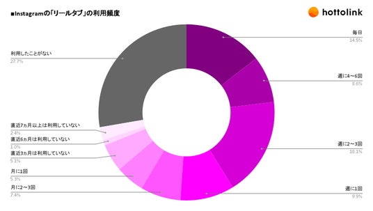 リールタブ(Instagramの下部メニュー、中央にある動画閲覧専用タブ)の利用頻度を聞いたところ、「毎日」が14.5%、「週に4~6回」が8.6%、「週に2~3回」が18.1%、「週に1回」が9.9%、「月に2~3回」が7.4%、「月に1回」が5.3%、「直近3ヵ月は利用していない」が5.1%、「直近6ヵ月は利用していない」が1.0%、「直近7ヵ月以上は利用していない」が2.4%、「利用したことがない」が27.7%となりました。