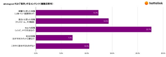 Instagramでよく「保存」するコンテンツを聞いたところ、「How To投稿(レシピ、メイク方法など)」が22.7%で、もっとも多い結果となりました。
