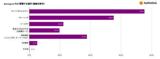 Instagramでよく閲覧する場所について聞いたところ、「フィード(タイムライン)」が75.3%、「ストーリーズ」が55.2%でした。