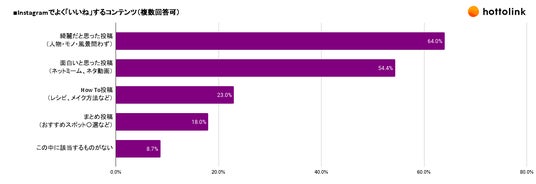 Instagramでよく「いいね」するコンテンツを聞いたところ、「綺麗だと思った投稿(人物・モノ・風景問わず)」が64%、「面白いと思った投稿(ネットミーム、ネタ動画)」が54.4%となりました。