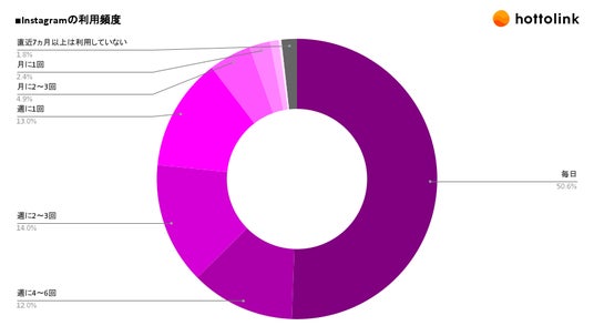 Instagramの利用頻度を聞いたところ、「毎日」が50.6%、「週に4~6回」が12.0%、「週に2~3回」が14.0%、「週に1回」が13.0%、「月に2~3回」が4.9%、「月に1回」が2.4%、「直近3ヵ月は利用していない」が1.0%、「直近6ヵ月は利用していない」が0.3%、「直近7ヵ月以上は利用していない」が1.8%となりました。