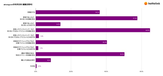 ・Instagramの主な利用目的は「知り合いではないアカウントの投稿を見る」が約65%で1位