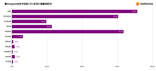 Instagram以外で利用しているSNSを聞いたところ、「LINE」「YouTube」「X(Twitter)」を選んだユーザーは、いずれも75%を超えました。