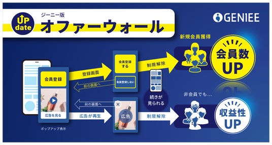 ジーニー版オファーウォールの特長は、訪問ユーザーが自然な形で会員登録を行うことを促し、サイトの固定ユーザーを獲得しやすくできることです。また、会員登録をしないユーザーには、より高単価の広告を表示させることで収益化を図ることができ、非会員からも効果的に収益を上げることができます。