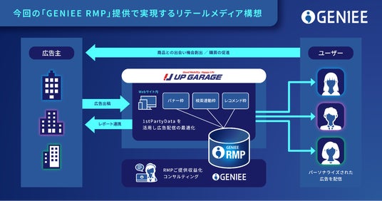 「GENIEE RMP」は、ECサイト内の広告配信設定から広告枠管理、収益レポート機能等、リテールメディア化を少ない工数で実現するための各種機能を搭載しています。これにより、アップガレージグループのリテールメディア事業構築におけるコンサルティングを含めて、総合的にサポートを提供していきます。