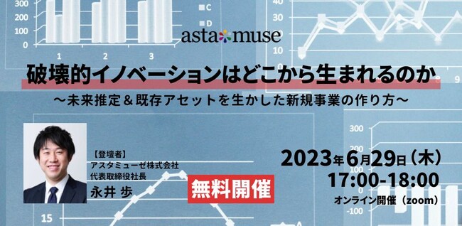 アスタミューゼ株式会社アスタミューゼ株式会社(本社:東京都千代田区、代表取締役社長 永井歩)は、2023年6月29日(木)17:00-18:00に、新規事業の企画や推進に関する課題をお持ちの経営者や担当者向けの無料ウェビナー「破壊的イノベーションはどこから生まれるのか ~未来推定&既存アセットを生かした新規事業の作り方~」を開催いたします。本年5月に開催し、ご好評いただいた同タイトルのウェビナーの再開催となります。