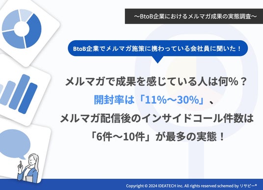 調査説明:BtoB企業のメルマガ施策において、配信頻度、配信コンテンツの内容、開封率などの実態を調査。また、どのような点において成果を感じるのかについても明らかにした。