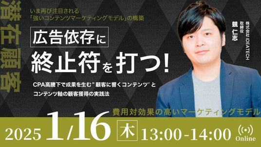 コンテンツPR・コンテンツマーケティング・コンテンツセールスを総合支援する、株式会社IDEATECH(本社:東京都港区、代表取締役社長:石川友夫、以下 IDEATECH)は、2024年1月16日(木)13:00-14:00に「広告依存に終止符を打つ!CPA高騰下で成果を生む"顧客に響くコンテンツ"とコンテンツ軸の顧客獲得の実践法」と題するオンラインセミナーを開催いたしますので、お知らせいたします。