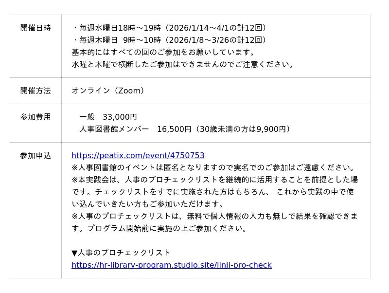 人事のプロチェックリスト」を軸に、仲間と実践を持ち寄り、ふりかえり、行動を"続ける"ための週1回の場「仲間と学ぶ実践会」の提供を開始しました。本実践会は、成果を競う場ではなく、それぞれの現場での実践を尊重しながら、行動とふりかえりのサイクルを無理なく続けられるリズムをつくることを目的としています。