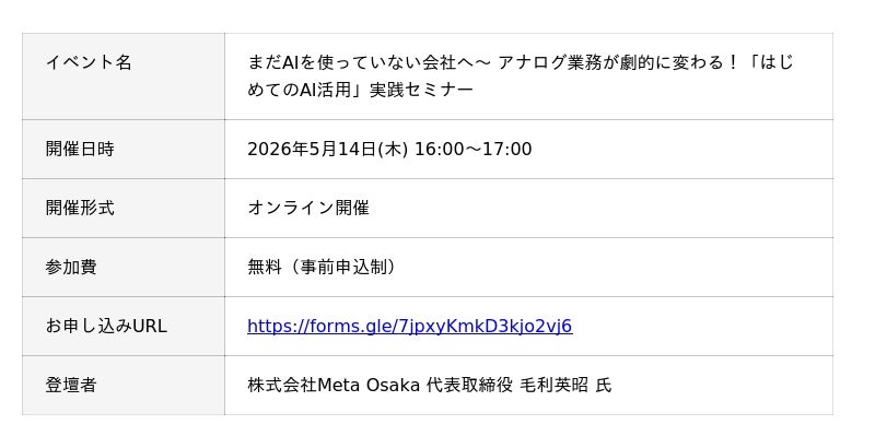株式会社Meta Heroes(本社所在地:大阪府大阪市、代表取締役:松石和俊、以下「当社」)は、「大阪を世界一おもろいまちにする」構想を掲げる株式会社Meta Osaka(代表取締役:毛利 英昭)と共同で、2026年5月14日(木)16:00より、経営層を対象としたオンラインセミナー「まだAIを使っていない会社へ~ アナログ業務が劇的に変わる!『はじめてのAI活用』実践セミナー」を開催いたします。毎月大好評をいただいているMeta Osaka様との共同セミナー企画の「5月編」として、今回は特に経営層の皆様へ向けた特別AIウェビナーを開催します。「AI時代、生き残る企業とは何か?」をテーマに、アナログ業界の業務プロセスを劇的に変革するための豊富な事例紹介と、明日からすぐに使えるAIワークショップをセットにした濃密な60分をお届けします。