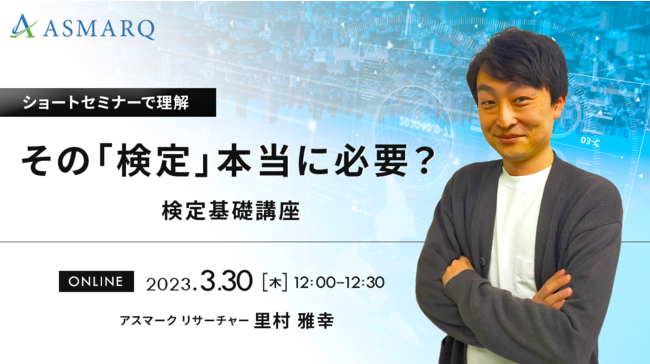 株式会社アスマーク(東京都渋谷区東、代表取締役:町田正一)は、2023年3月30日(木)12:00に、定量調査の分析手法「検定」をテーマに、リサーチャー里村雅幸によるショートセミナーを開催いたします。ライブセミナー形式で「検定」の基礎理解から、リサーチャー独自の「真に有効な検定」についての見解をお届けいたします。