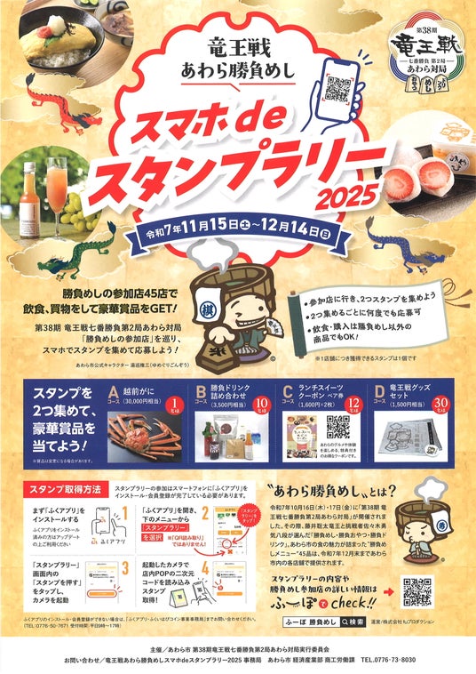 日本将棋界最高峰のタイトル戦「第38期竜王戦七番勝負」第2局が、福井県あわら市で開催されました。これを記念し、あわら市では地元グルメを楽しみながら参加できる「勝負めしスタンプラリー」を実施中です。スマートフォンで簡単に参加でき、抽選で豪華賞品が当たります。