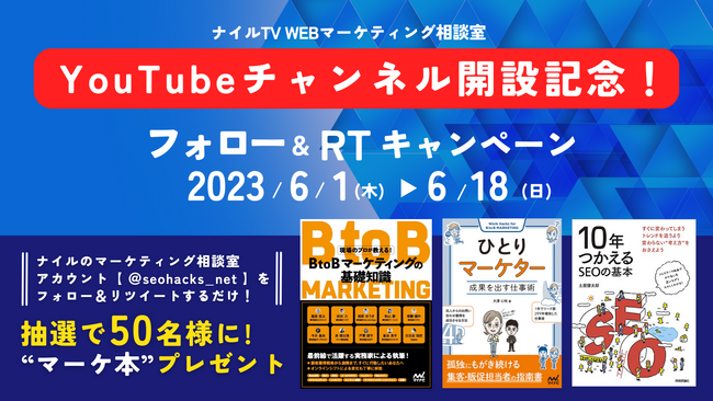 ナイル株式会社マーケティングDX事業を営むナイル株式会社(本社:東京都品川区、代表取締役:高橋 飛翔、以下、ナイル)は、Webマーケティングのノウハウを発信する、公式YouTubeチャンネル「ナイルTV / WEBマーケティング相談室」を開設しました。YouTubeチャンネル開設を記念して、抽選で50名様に「Webマーケティング本」が当たるフォロー&RTキャンペーンを実施いたします。