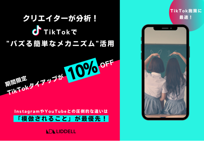 インフルエンサーマーケティング事業を展開するLIDDELL株式会社 (本社:東京都港区、代表取締役:福田 晃一、以下リデル) は、ショートムービープラットフォーム「TikTok(ティックトック)」をTikTokで活躍するクリエイターが分析した「バズる法則を3か条」を活用した、【 TikTokタイアップが10% OFF 】キャンペーンを開始しました。