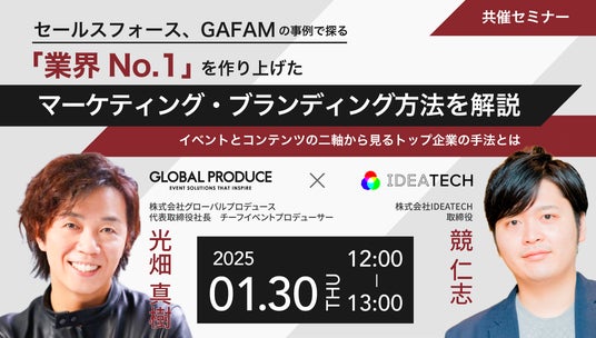 コンテンツPR・コンテンツマーケティング・コンテンツセールスを総合支援する、株式会社IDEATECH(本社:東京都港区、代表取締役社長:石川友夫)は、株式会社グローバルプロデュース(本社:東京都渋谷区、代表取締役社長:光畑 真樹)と共同で、2024年1月30日(木)12:00-13:00に「セールスフォース、GAFAMの事例で探る「業界No.1」を作り上げたマーケティング・ブランディング方法を解説~イベントとコンテンツの二軸から見るトップ企業の手法とは~」と題するオンラインセミナーを開催いたしますので、お知らせいたします。