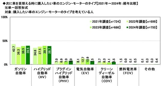 次に車を買替える時に購入したい車のエンジン・モーターのタイプ【2021年~2024年:経年比較】