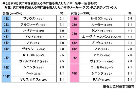 男女別にみると、男性では1位「プリウス(トヨタ)」(5.1%)、2位「アルファード(トヨタ)」(4.1%)、3位「ハリアー(トヨタ)」(3.9%)、4位「アクア(トヨタ)」(3.7%)、5位「ノア(トヨタ)」(3.0%)、女性では1位「N-BOX(ホンダ)」(6.4%)、2位「ルーミー(トヨタ)」(5.1%)、3位「タント(ダイハツ)」「ムーヴ キャンバス(ダイハツ)」(いずれも4.1%)、5位「プリウス(トヨタ)」(3.1%)となりました。