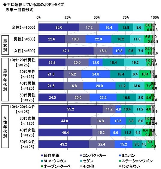 全回答者1,000名に、主に運転している車のボディタイプを聞いたところ、「軽自動車」(35.0%)が最も多くなり、「コンパクトカー」(17.2%)、「ミニバン」(16.4%)、「SUV・クロカン」(12.9%)、「セダン」(9.6%)が続きました。