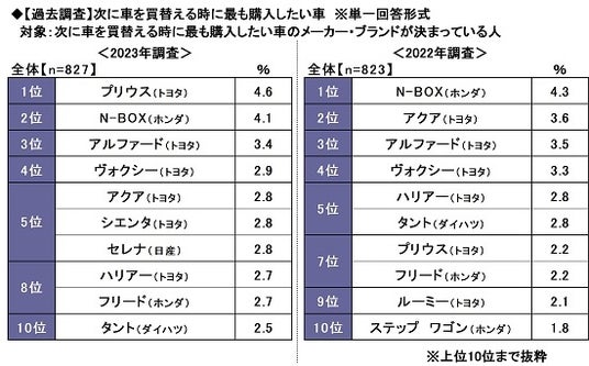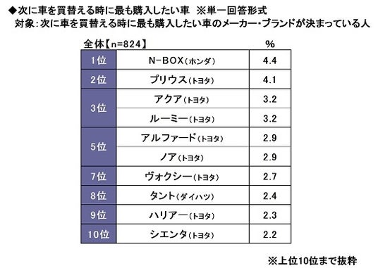 ◆次に車を買替える時に購入したい車 1位「N-BOX(ホンダ)」2位「プリウス(トヨ