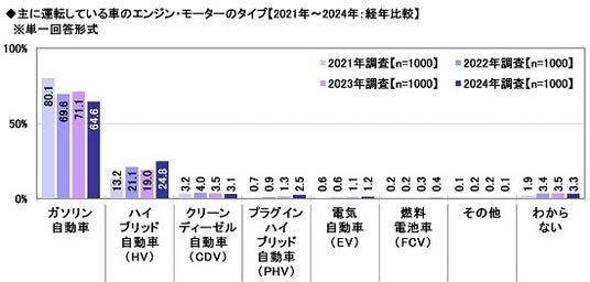 主に運転している車のエンジン・モーターのタイプ【2021年~2024年:経年比較】