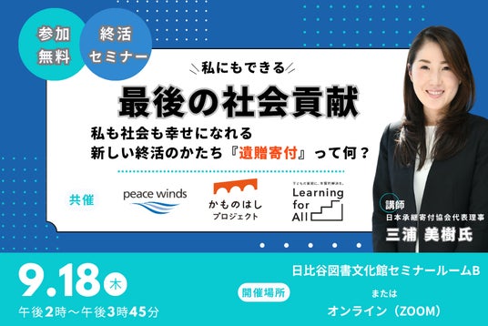 認定NPO法人ピースウィンズ・ジャパン(代表理事:大西健丞 本部:広島県神石高原町)は、この度、終活セミナー「最後の社会貢献 新しい終活のかたち『遺贈寄付』って何?」を開催します 。本セミナーは、認定NPO法人Learning for Allと認定NPO法人かものはしプロジェクトとの共催で行います。