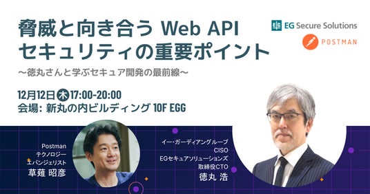 https://www.eg-secure.co.jp/ 東京都港区 代表取締役:高谷 康久 以下、「EGセキュアソリューションズ」)は、API開発をリードするPostman株式会社(東京都千代田区 代表取締役社長:平林 良昭 以下、「Postman」)と共催で、Web APIセキュリティをテーマにしたセミナーを2024年12月12日(木)に開催いたします。