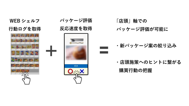 ・「WEBシェルフ」で取得できる行動ログと「パッケージ評価」から取得できる反応速度の掛け合わせにより、商品の見られ方、買われ方を明らかにし、店頭で買ってもらえるパッケージかどうかを検証。