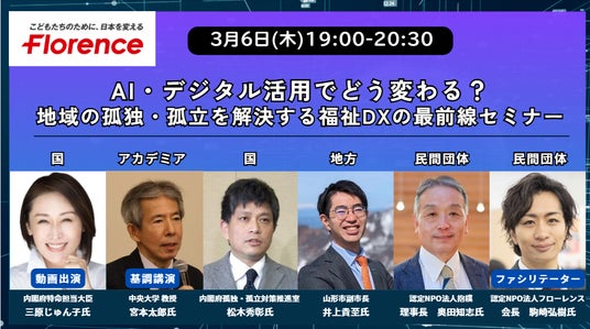 本セミナーでは、内閣府特命担当大臣 三原じゅん子氏をはじめ、孤独・孤立対策推進室 参事官 松木秀彰氏、中央大学 教授 宮本太郎氏など、国の政策立案者や専門家が登壇し、孤独・孤立対策における AI・デジタル活用の展望について語ります。